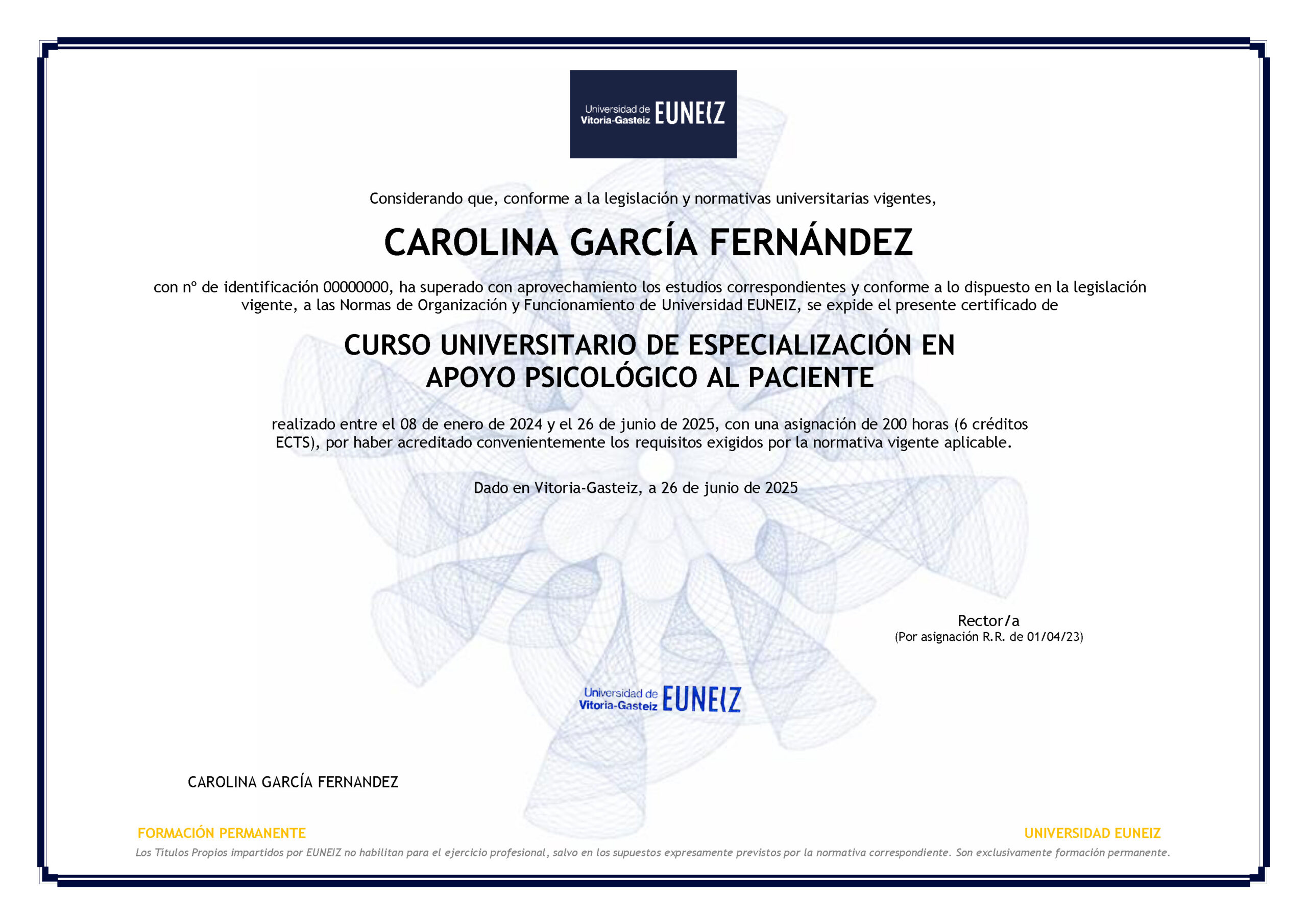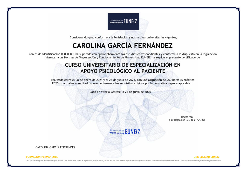 Si el título o diploma lo expide la Universidad de Vitoria, el curso se lleva a cabo dentro del Plan de Formación Permanente de la Universidad de Vitoria EUNIZ en el marco del Espacio Europeo de Educación Superior.