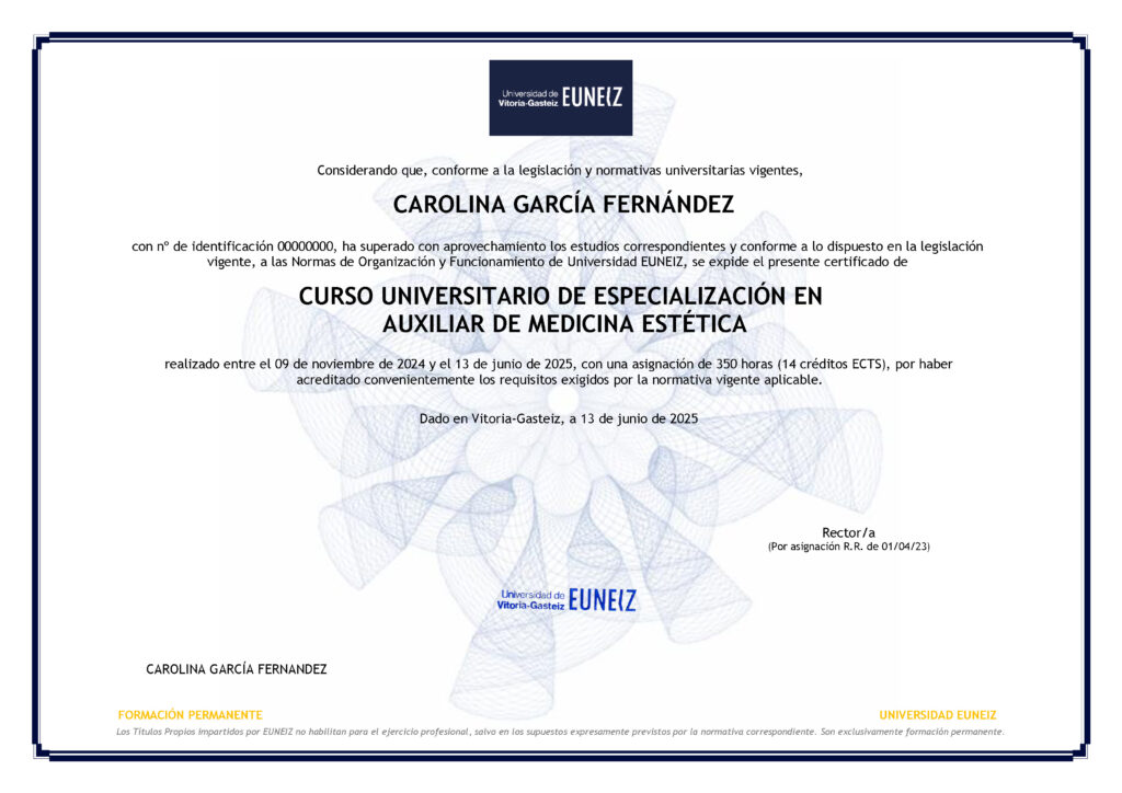 Es importante tener en cuenta que, como Auxiliar de Medicina Estética, trabajarás bajo la supervisión y dirección de un médico especializado. Esta magnífico Curso de Auxiliar de Medicina de Estética está acreditado a través de la Universidad, y conforme a la legislación vigente implantada desde el Ministerio de Educación, aportando créditos ECTS como un título propio (ECTS = Créditos del Sistema de Transferencia Europeo, por tanto, homologables y reconocidos en todo el espacio de la Unión Europea).