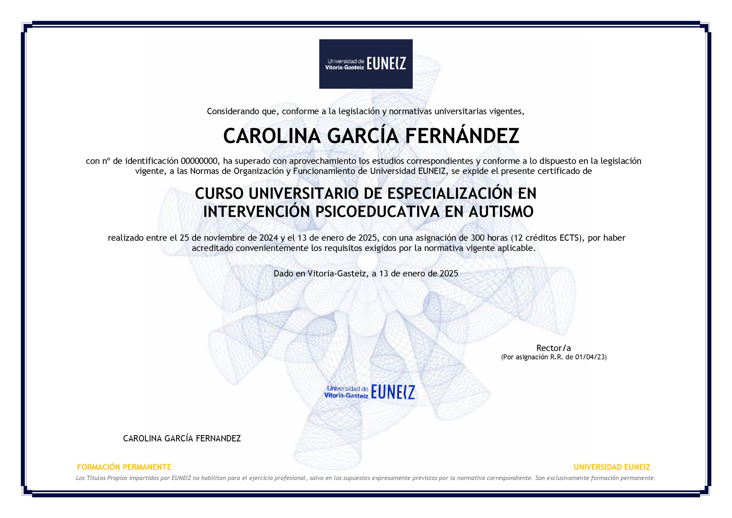 Diploma Universitario expedido por la Universidad de Vitoria-Gasteiz